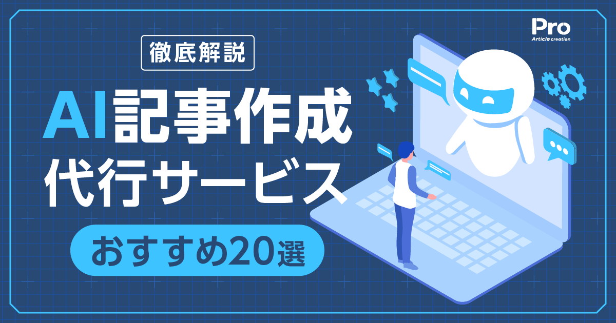 「AI記事作成代行って何?」 「記事の作成を依頼したいけど、何を基準に選べばよいかわからない」 自社で抱えるリソースの問題やより質の高い記事を執筆したいという思いから、プロに記事の執筆を依頼したいと考える方も多いでしょう。 本記事では、AI記事作成代行の概要や依頼するメリット、おすすめのAI記事作成代行サービスについてわかりやすく解説します。 記事作成をプロに依頼したいと考えている方はぜひ参考にし …