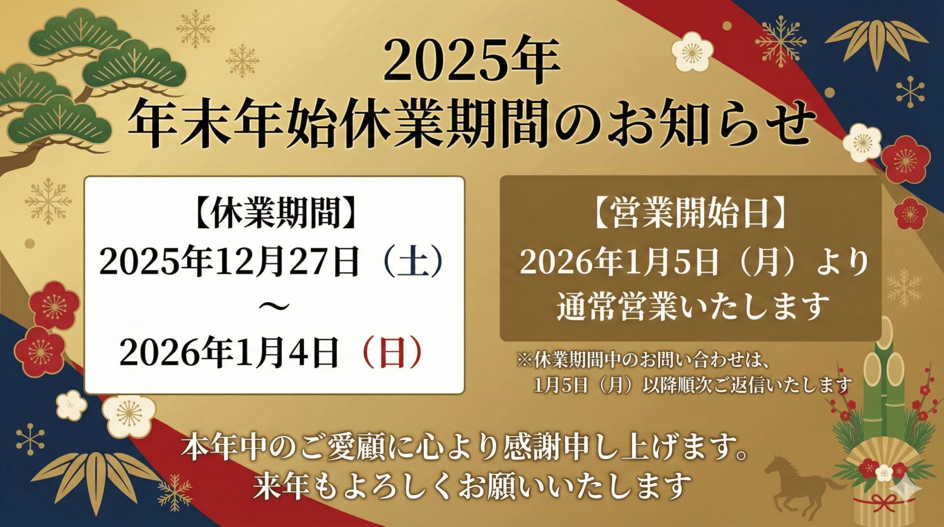 2025年 年末年始休業期間のお知らせ